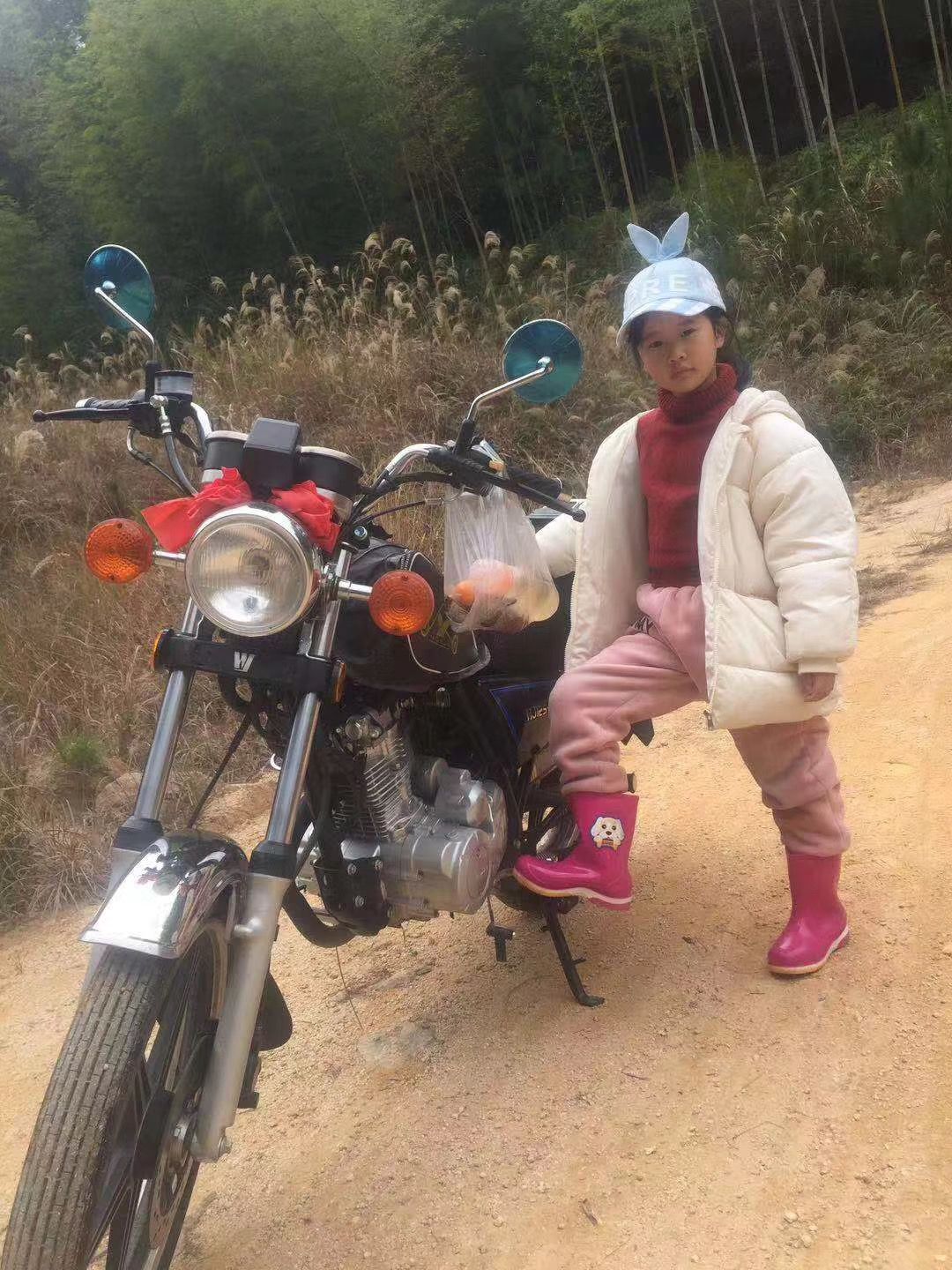 那辆摩托车,载着我和女儿的山野时光 这张照片里的风,我到现在都记得清清楚楚。 是山间的风,裹着竹涛的清响,混着枯草的淡香,扑在脸上,带着泥土的温度。我的大女儿,就那样歪着身子靠在摩托车旁,兔耳朵的帽子歪歪地扣在头上,红毛衣衬着白棉袄,粉裤子配着亮闪闪的雨靴,手里还攥着半袋刚从路边摘的野果,眼睛亮晶晶地望着镜头,像一捧刚从阳光里捞出来的小太阳。 那是我们人生里,最松弛、最快乐的一刻。 没有城市的车水马龙,没有工作的琐碎压力,没有柴米油盐的鸡毛蒜皮。只有一辆旧摩托车,一条乡间土路,一片漫山的竹林,和我身边这个慢慢长大的小姑娘。我骑着车带她往山里走,风从耳边呼啸而过,她在后座紧紧抱着我的腰,叽叽喳喳地说着学校的趣事,指着路边的野花喊我停,追着飞过的蝴蝶笑出声。那一刻,我才真正懂了,所谓幸福,从不是什么惊天动地的大事,不过是陪着我的孩子,在山野里撒欢,在时光里慢慢走。 这辆摩托车,是我年轻时的伙伴,如今又成了载着女儿童年的小船。车头系着的红绸,是她非要绑上的,说这样摩托车就有了“好运buff”;车把上挂着的塑料袋,装着她攒了一路的“宝贝”——几颗野橘子,几朵小野花,还有一块形状奇怪的