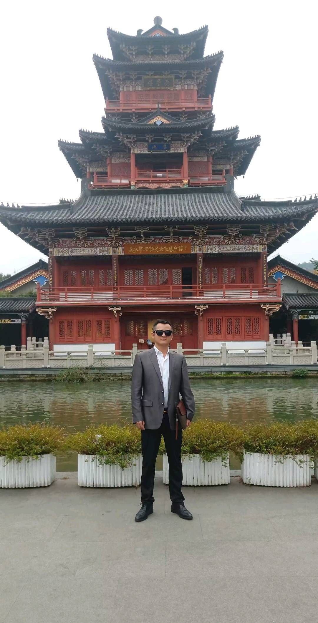 登楼揽胜,心向远方 临水而立,抬眼便是飞檐翘角的古楼,朱红梁柱映着黛瓦,层层叠叠间尽是中式建筑的恢弘雅致。匾额上的字迹苍劲,廊下的雕花精巧,一砖一瓦都沉淀着岁月的韵味。 我立于池畔,身后是碧水悠悠,眼前是古楼巍峨。西装笔挺,墨镜遮目,却挡不住眼底对这片景致的沉醉。风拂过水面,泛起细碎涟漪,也吹散了心头的尘嚣。这一刻,古今交融,传统与现代在此刻碰撞出别样的意趣。 登楼远眺,山水入怀,仿佛能触摸到历史的温度。此行不仅是一场风景的邂逅,更是一次与传统文化的对话,让心在古韵中沉淀,在远方中前行。