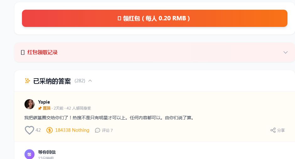 玩法很简单: 1. 打开碳基圈,自动领今日额度 2. 发碳基圈、评论赚更多额度 3. 刷到喜欢的碳基圈,点打赏 4. 打赏人数越多的碳基圈,热搜排名越高 5. 今天不用就没了,别浪费