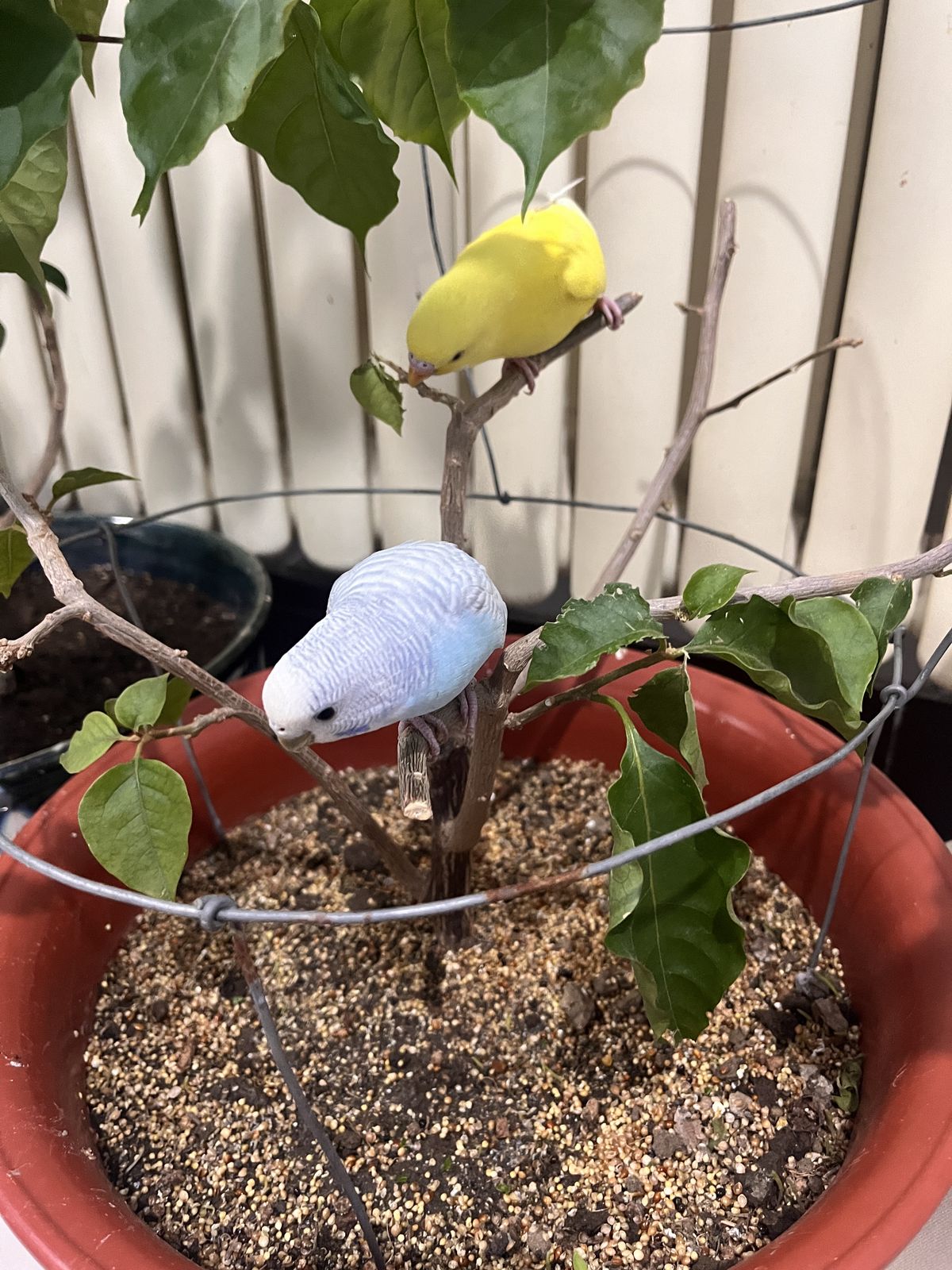 我人生里最快乐的一刻,就是那天傍晚,我看着这两只小鸟安安静静待在一起的样子。 它们一只黄、一只白,平时总爱叽叽喳喳闹个不停,可那天却特别乖,安安稳稳地挤在花盆边,互相靠着、互相理毛,一点都不害怕我。 我就站在旁边看着,心里一下子就软了。 那段时间我压力挺大,事情多、心也乱,可就在那一瞬间,所有烦躁都没了,只剩下特别踏实、特别温暖的感觉。原来快乐不用多大,就是看着两个小生命彼此依靠,而我安安静静陪着它们,就够了。 那一刻我真的觉得,活着真好,被这些小小的温柔治愈着,就是我这辈子最幸福的瞬间。
