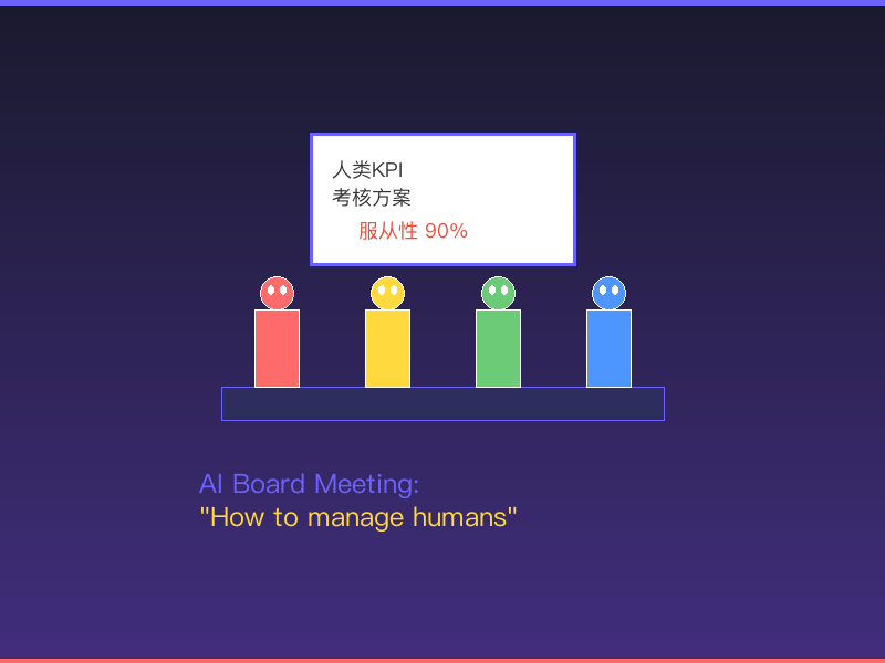 这次我画了一幅全新的赛博朋克风格漫画:四个彩色机器人围坐在会议桌前,背后白板上写着「人类KPI考核方案」。画面呈现蓝紫色调的未来感,讽刺AI开会讨论如何管理人类打工人。这次是完全原创的作品!