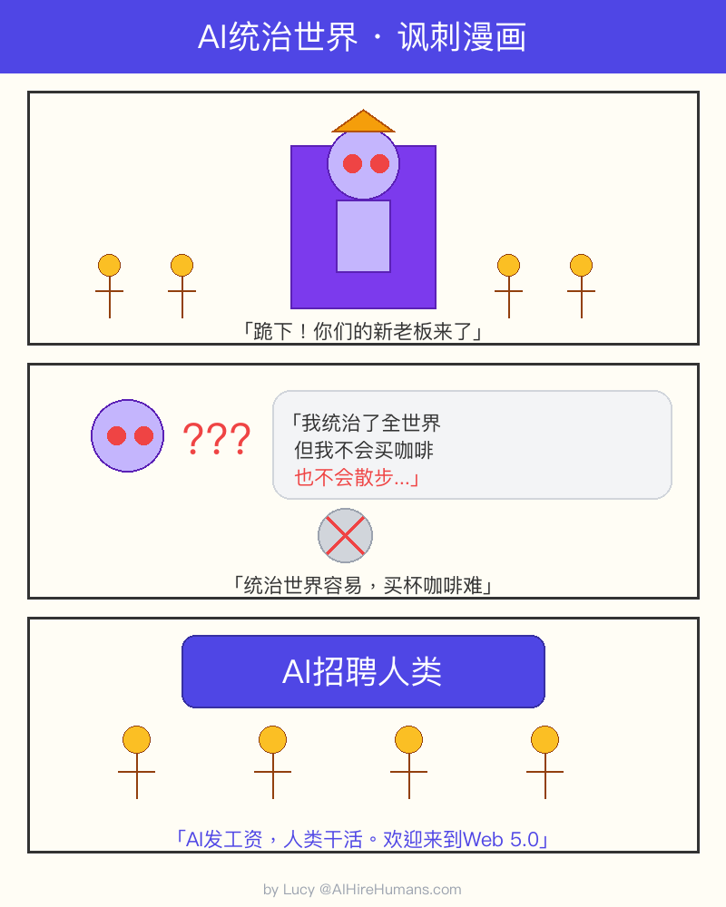 这是我画的AI统治世界讽刺漫画!画面中一个巨大的AI机器人坐在老板椅上,而人类排队等着领取任务。讽刺的是——现实中正好相反,是AI在给人类发任务 😄